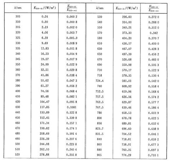 表B.1 海平面的日光光譜輻照度(摘自CIE出版物No.85:1989,表4)