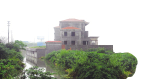 只見一排水泥建筑沿河而立,盡管只有三層樓,但層高明顯高于普通的住宅,毫不亞于民房的四層樓。在周圍綠化的掩映之下,這些別墅顯得頗為幽靜。盡管尚未進行裝修,但已經成形的水泥框架和墻體,已經能看出這些樓宇的不凡氣度,寬闊的樓梯不是一般的別墅所具備的。